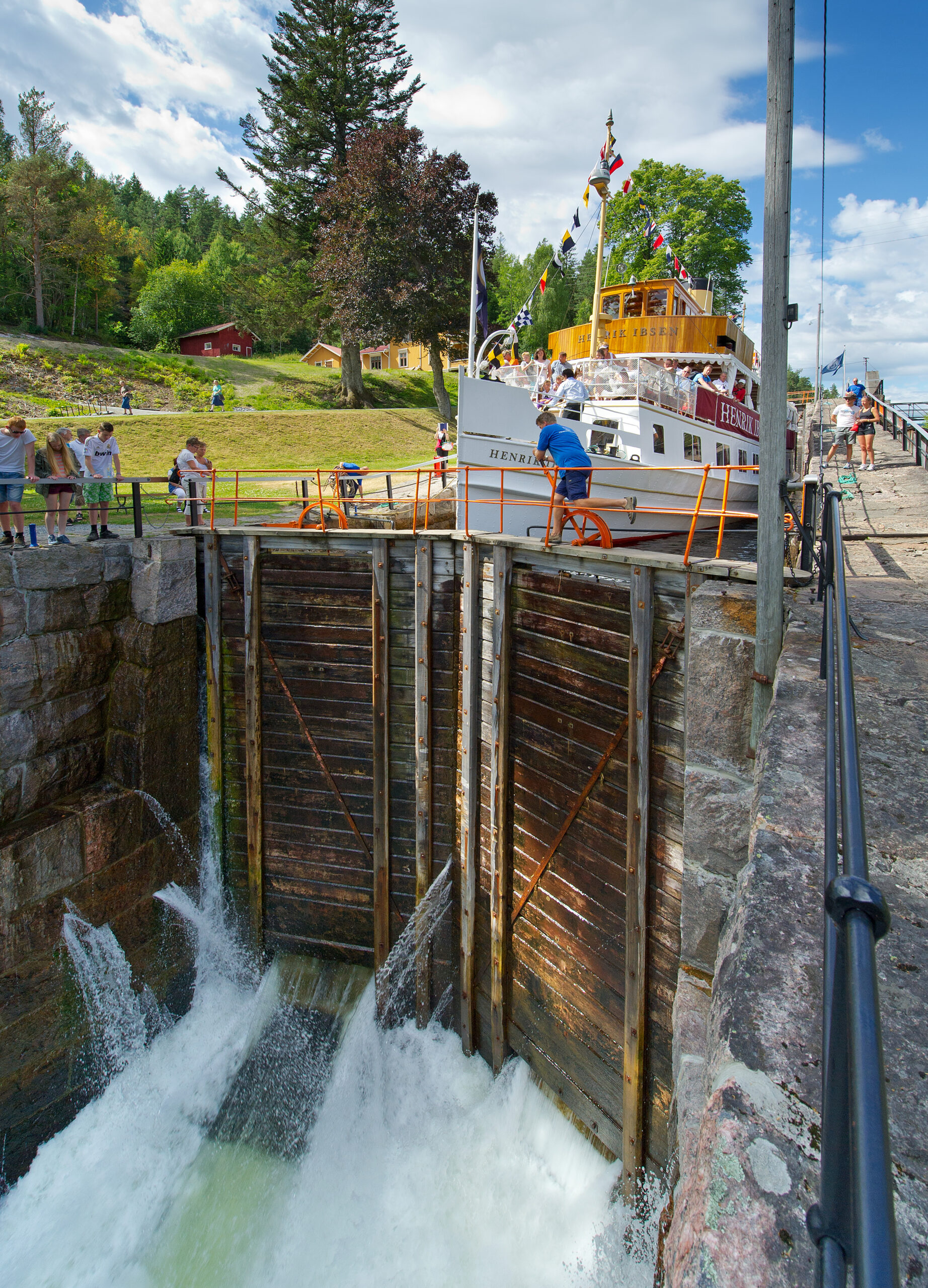 Dagen etter går du på kanalbåten i Skien og nyter en nydelig tur på verdens vakreste vannvei med imponerende ingeniørkunst og storslått natur.